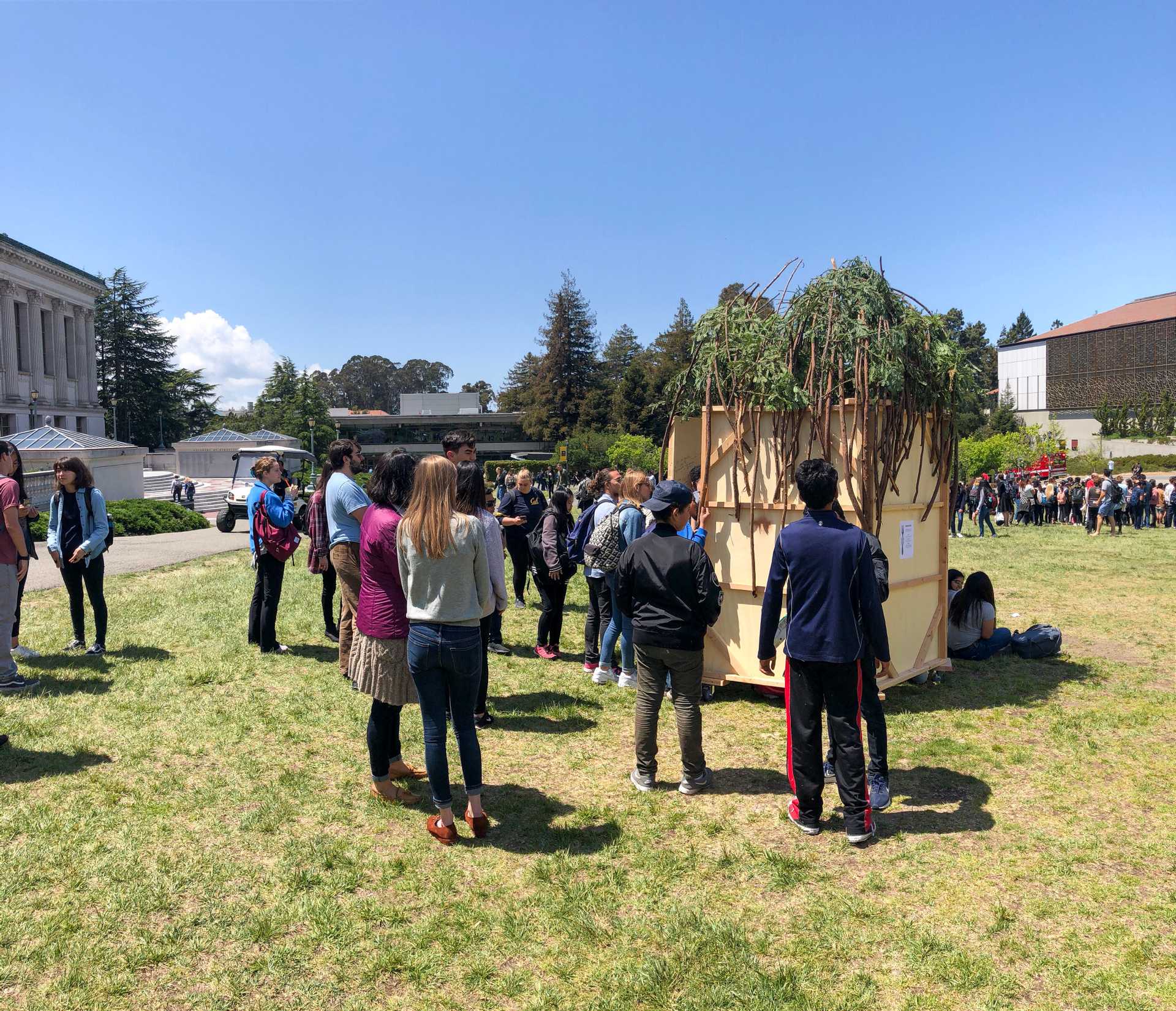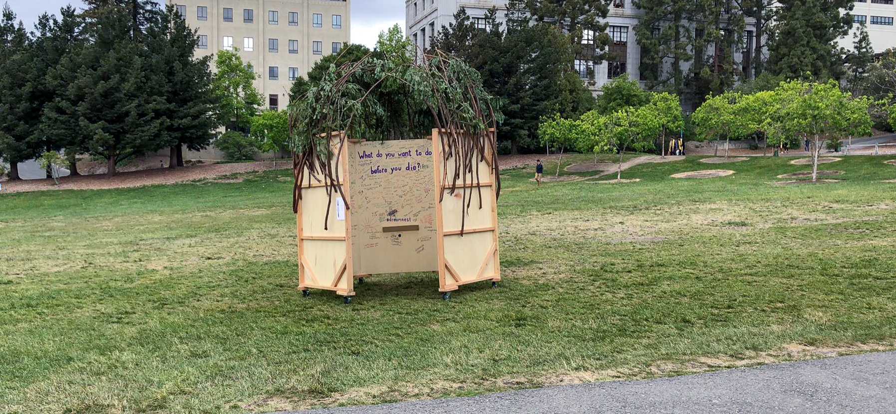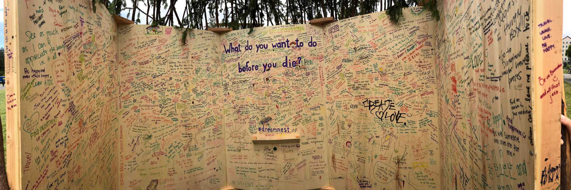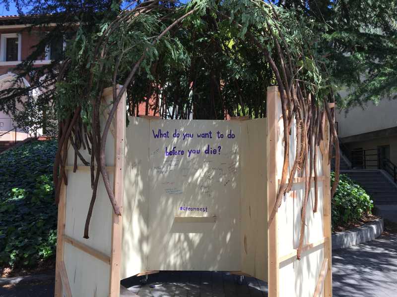 The result of our exploration was a sculpture called Dreamnest. Like a bird’s nest perched on a tree branch, Dreamenst was built to give Berkeley students a hideaway to reconnect with their dreams and aspirations. Inside the nest we posed the question “What do you want to do before you die?“ and encouraged the students to write their responses on the walls. By the end of the project all the walls were filled with beautifully honest and inspirational responses.